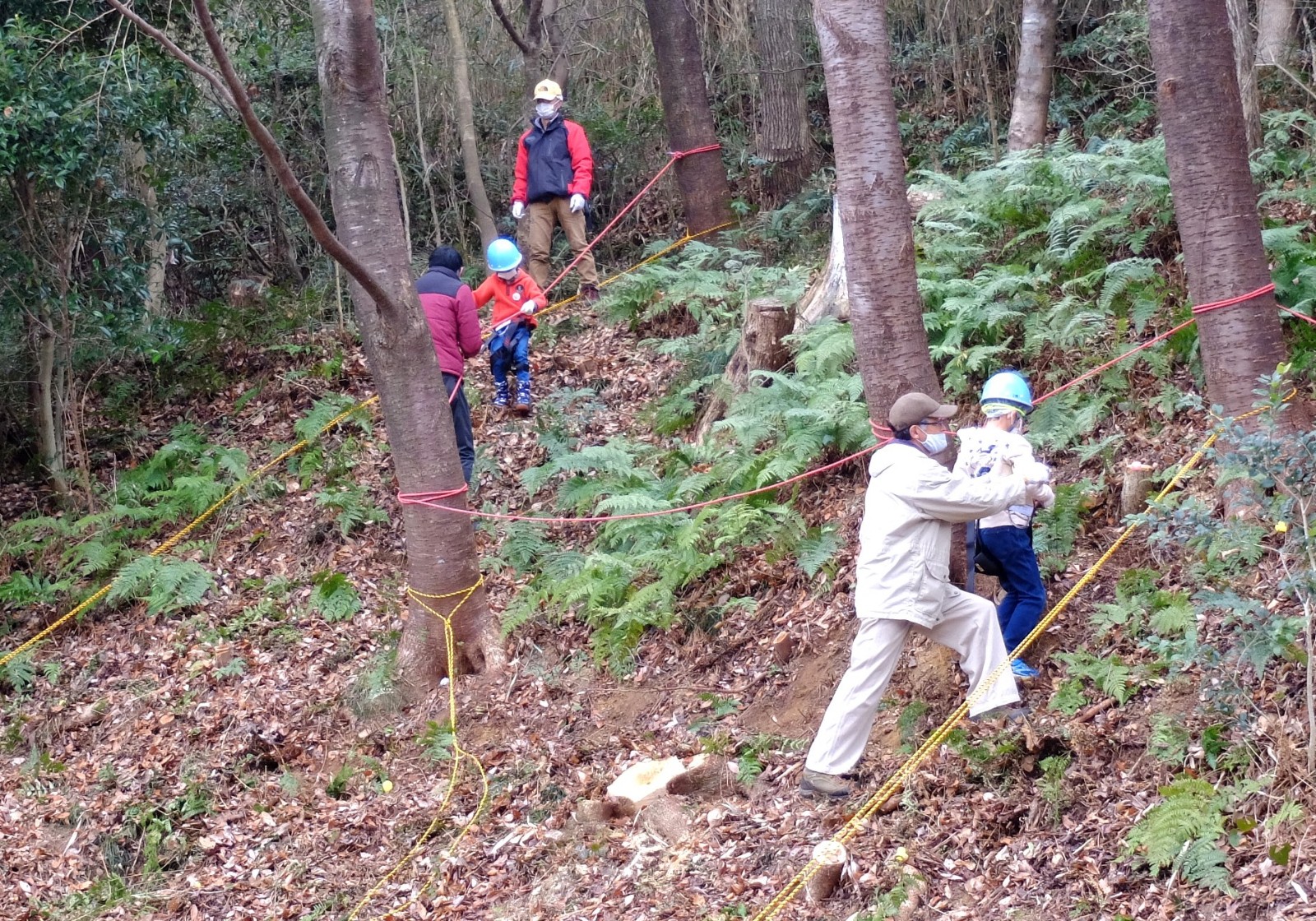 たとえば、山の斜面を利用した「レスキューロープ遊び」薪ストーブで焼きマシュマロ